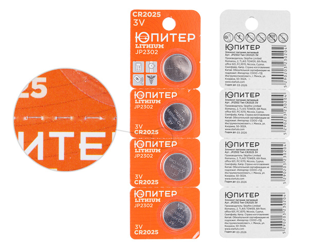 Батарейка CR2025 3V lithium 4шт. ЮПИТЕР (блистер с линиями отрыва) (JP2302)
