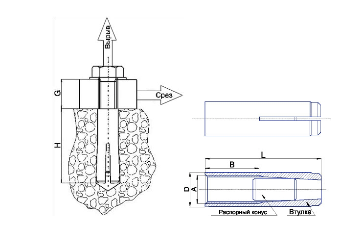 | Обозначение (A х D x L) | A, резьба | B, длина резьбы, мм | D, диаметр отверстия под анкер, мм | L, длина анкера, мм | Глубина завинчивания, мм | Н, глубина анкеровки, мм |