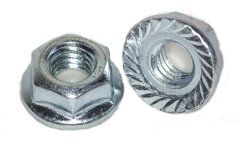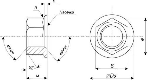 Гайка шестигранная с фланцем, внутренняя сторона фланца выполнена со специальными насечками которые предотвращают самопроизвольное откручивание гайки.