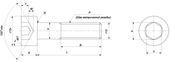 | Размер (d x L) | Шаг резьбы, мм | В, мм | Dk, мм | D, мм | e, мм | s, мм | k, мм | t, мм | w, мм |