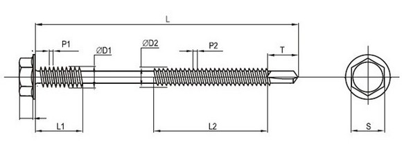 Дополнительная резьба увеличенного диаметра под головкой самореза жестко удерживает расстояние между обшивками плиты, одновременно повышая эффективность и плотность соединения. Головка шестигранная под насалку 5/16 (8 мм).