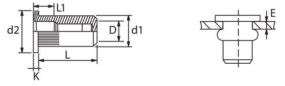 | Обозначение | Диаметр заклёпки, d1(±0,25), мм | Диаметр фланца, d2 (±0,25), мм | Толщина фланца, K, мм | Длина заклёпки, L (±0,3), мм | Расстояние до начала резьбы, L1(±0,3), мм | Толщина прикрепляемого материала, E, мм |