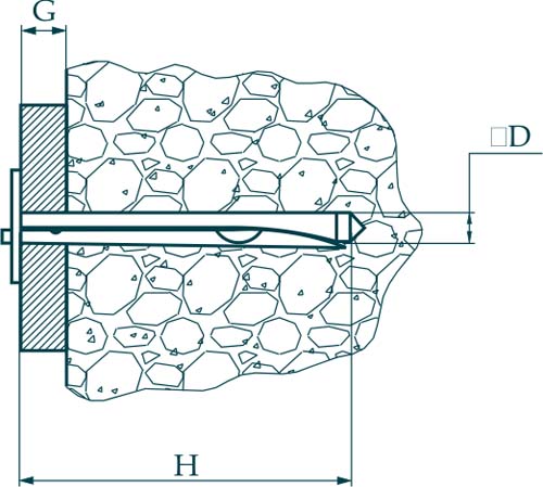 | Обозначение (D x L) | G, толщина прикрепляемого материала, мм | H, минимальная глубина анкеровки, мм | Мин. вырывающая сила, kH |