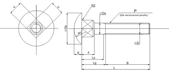 | Размер(D x L) | P, мм(шаг резьбы) | B, мм | F, мм | Dk, мм | Ds, мм | k, мм | V, мм |
