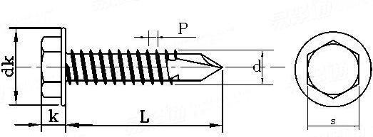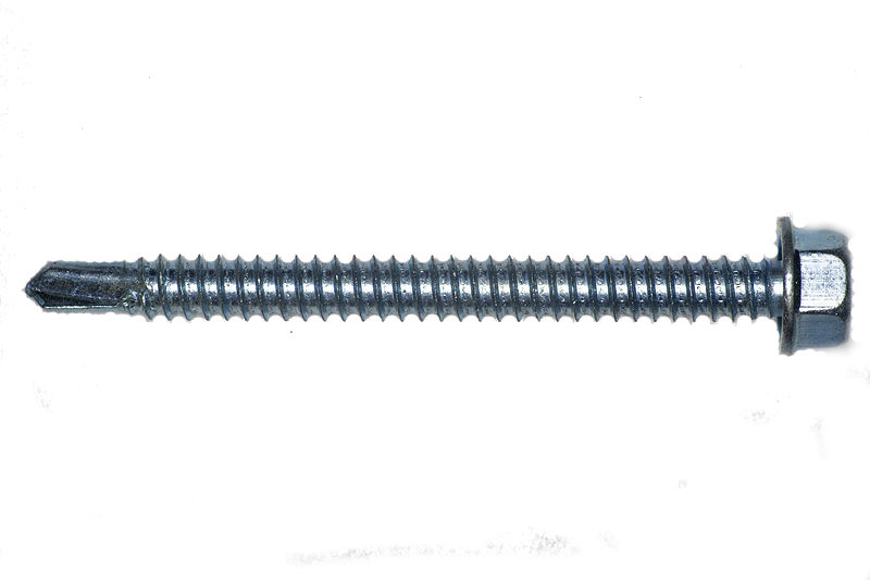 Саморез снабжен шестигранной шайбированной головкой и однозаходной острой резьбой сбегающей на наконечник-сверло.