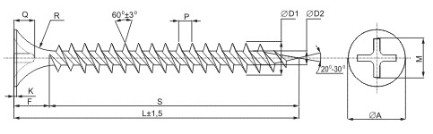 Потайная головка, крестообразный шлиц Philips № 2, острый наконечник с мелким шагом, оксидированные.