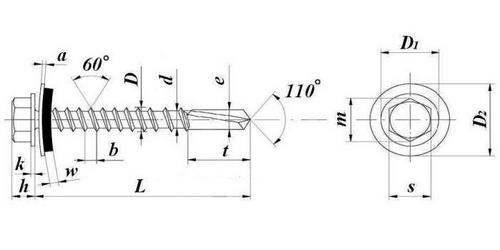 Особенности конструкции: шестигранная головка (D8\10 мм)в зависимости от диаметра, стальная шайба диаметром 16мм c резиновой прокладкой. Резиновая прокладка служит для гидроизоляции крепления. Минимальная толщина стальных скрепляемых конструкций 1,5мм. Максимальная толщина стальных конструкций, в которые производится сверление - 12мм.